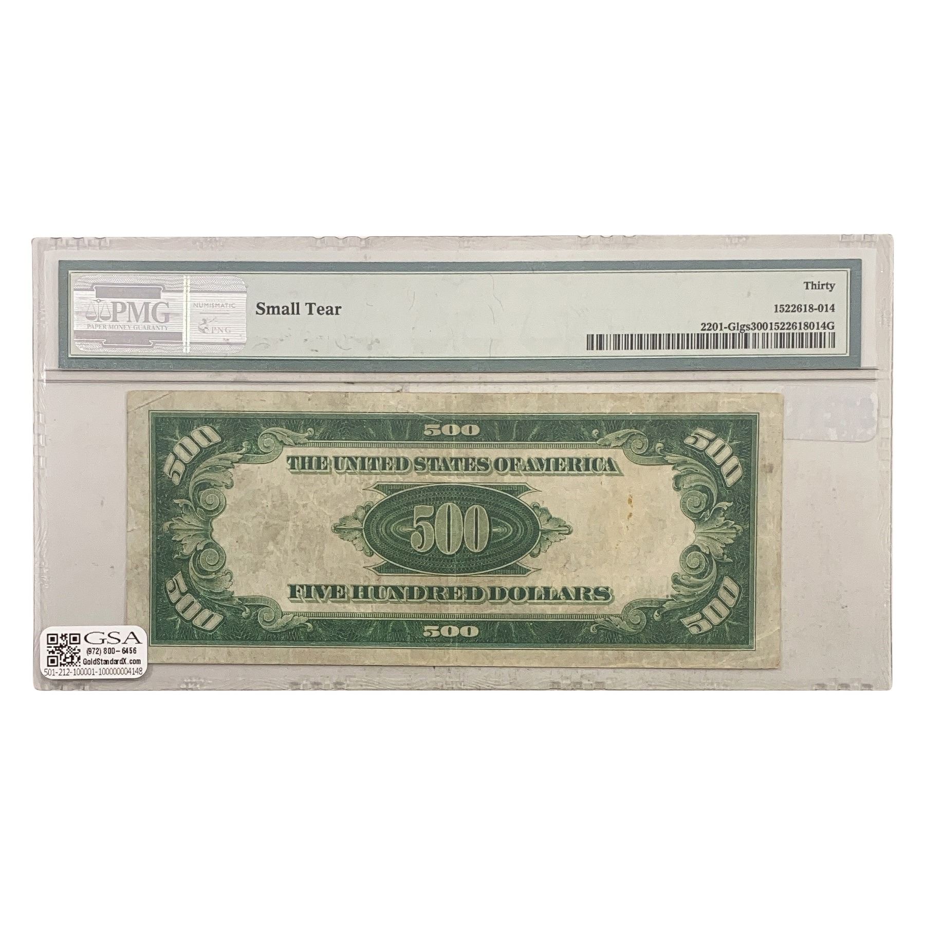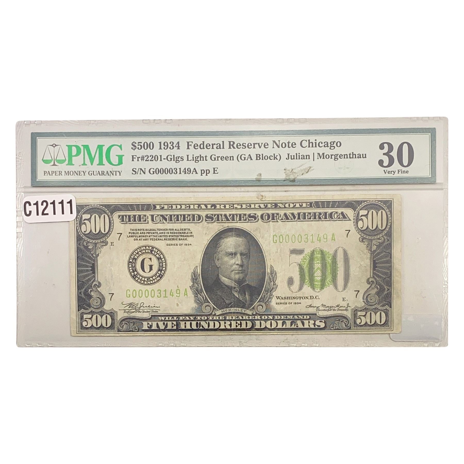 f. Notes sold referencing a third-party grading service are sold “AS IS” without any express or implied warranty, except for guarantee by GSA that they are genuine. Grading, condition or other attributes of any Product may have a material effect on its value and the opinion of others, including third-party grading services such as PCGS Currency and PMG may differ with that of GSA. GSA shall not be bound by any prior or subsequent opinion, determination, or certification by any grading service. Bidders specifically waive any claim to right of return of any Product because of the opinion, determination, or certification, or lack thereof, by any grading service. Certain warranties may be available from the grading services and Bidders are referred to them for further details: Paper Money Guaranty (PMG), PO Box 4711, Sarasota, FL 34230; PCGS Currency, PO Box 10470, Peoria, IL 61612-0470; PCGS Gold Shield, PO Box 9458, Newport Beach, CA 92658. Third-party graded notes are not returnable for any reason whatsoever.