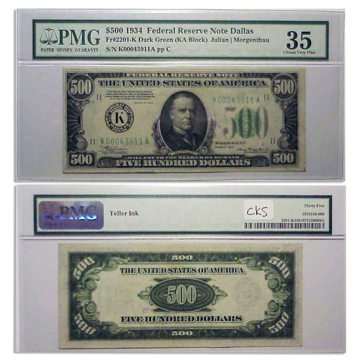 $500 Federal Reserve Note -- Series 1934, Dallas -- Graded PMG 35