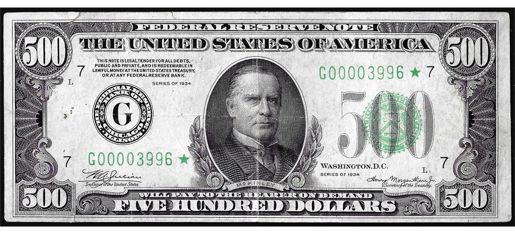 One 1934 $500 Federal Reserve STAR Note Chicago.