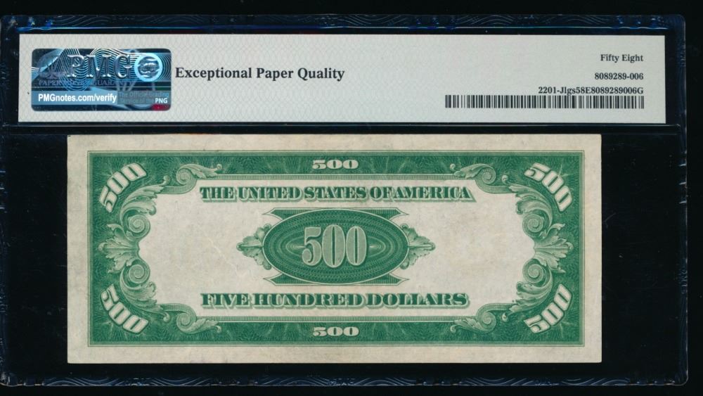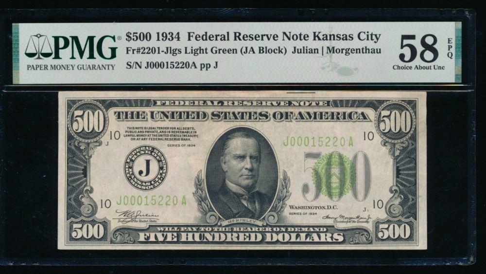 One 1934 $500 Kansas City FRN PMG 58EPQ.