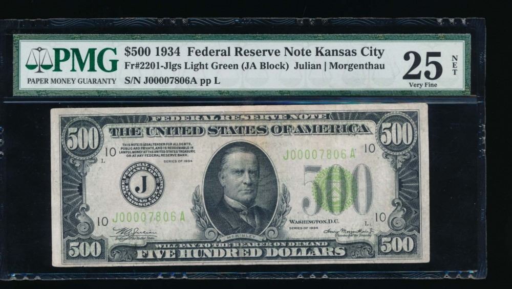 One 1934 $500 Kansas City Federal Reserve Note PMG 25NET.