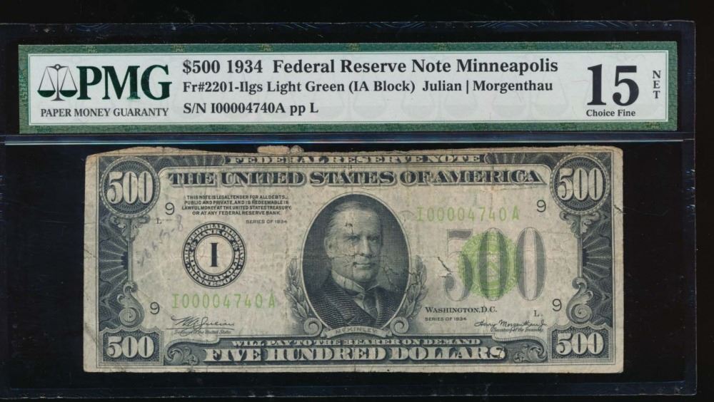 One 1934 $500 Minneapolis Federal Reserve Note PMG 15NET.
