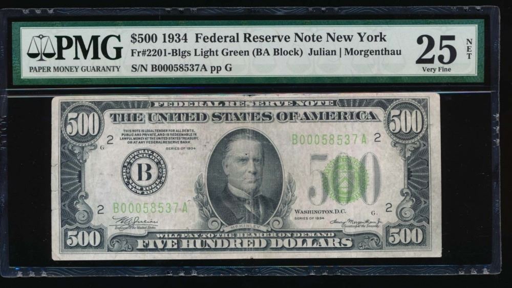 One 1934 $500 New York Federal Reserve Note PMG 25NET.