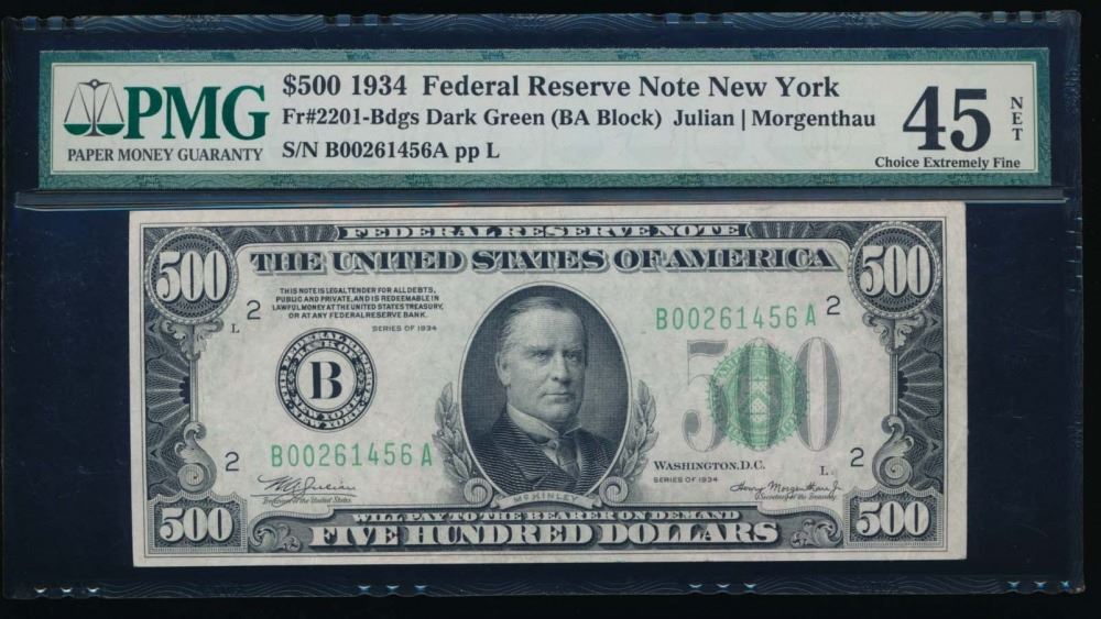 One 1934 $500 New York Federal Reserve Note PMG 45NET.