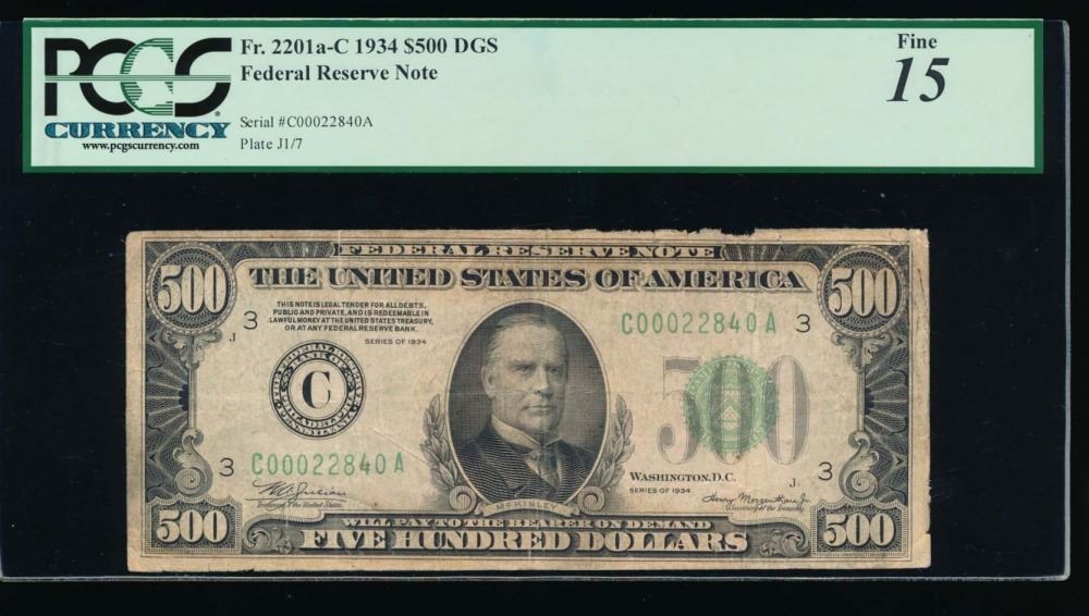 One 1934 $500 Philadelphia Federal Reserve Note PCGS 15.