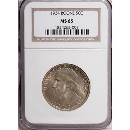 <B>1934 50C Boone MS65 NGC.</B></I> NGC Census: (392/172). PCGS Population (510/209). Mintage: 10,007. Numismedia Wsl. Price for NGC/PCGS coin in MS65: $220. (#9257)<BR><I>From The Frank DuVall Collection of U.S. Commemoratives.</B></I><BR><BR><b>Shipping:</b> Coins & Currency (<a target="_blank" href="http://www.heritageauctions.com/common/shipping.php">view shipping information</a>\)