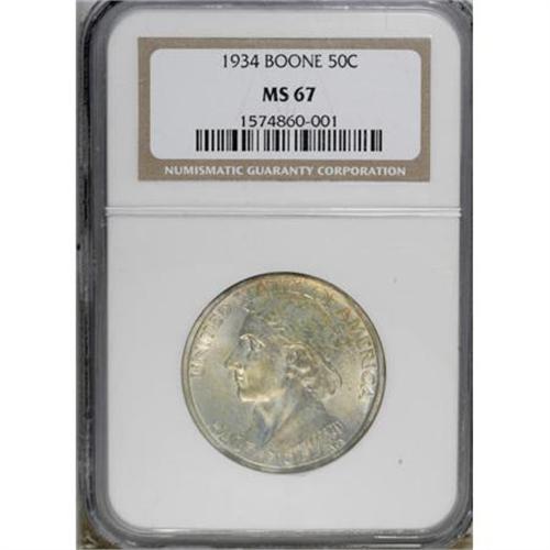 <B>1934 50C Boone MS67 NGC.</B></I> Attractive steel-green toning is accented by scattered copper-orange color on both sides. Typically well struck and nearly pristine, a great Superb Gem example. Census: 18 in 67, 1 finer (1/08). <BR><BR><b>Shipping:</b> Coins & Currency (<a target="_blank" href="http://www.heritageauctions.com/common/shipping.php">view shipping information</a>)