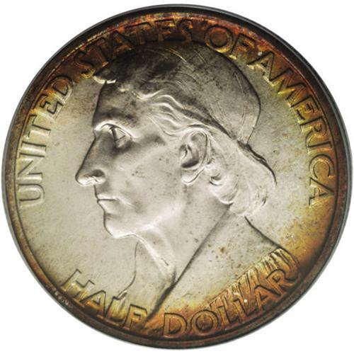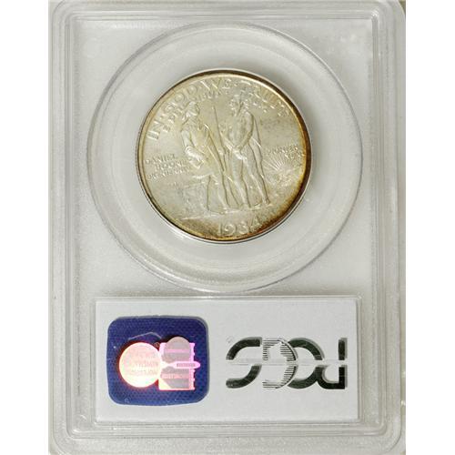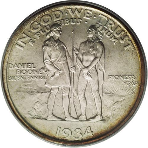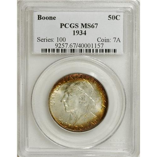 <B>1934 50C Boone MS67 PCGS.</B></I> A deep ring of olive-gold and russet toning encircles the obverse of this originally toned example, while the center has a thin blanket of ivory patina. The color scheme on the reverse is similar, although only a sliver of rouge toning is evident at the rims. Strong luster shines beneath. The 10,007 examples coined for this classic commemorative represented a small mintage for the time, though worse was to come. PCGS has graded only one coin finer (3/07).<BR><I>From The Cary & Cheryl Porter Collection.</B></I><BR><BR><b>Shipping:</b> Coins & Currency (<a target="_blank" href="http://www.heritageauctions.com/common/shipping.php">view shipping information</a>)