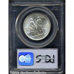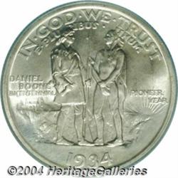 <B>1934<50C> Boone MS67 PCGS.</B></I> The Daniel Boone Commission, of Lexington, Kentucky, prevailed on Congress to authorize the mintage of 600,000 commemorative half dollars celebrating Boone's 200th year. This became the Act of May 26, 1934. A total of 108,000 pieces were coined, and subsequent to some meltings in 1937 and 1938, a net mintage of 86,600 pieces remained. The initial batch of Boone half dollars, struck at Philadelphia in October 1934, consisted of only 10,000 pieces. This specimen displays bright luster beneath localized splashes of gold toning. The design features reveal bold striking impressions, and a few small, inconspicuous marks on the obverse do not distract. This example will make an excellent addition to a high grade commemorative collection. Population: 19 in 67, 0 finer (6/04).<BR><I>Ex: Long Beach Signature Sale (Heritage, 2/01), lot 6032, which realized $1,322.50.</B></I><BR><I>From the JFS Collection, the #1 All-Time PCGS Registry Set.</B></I> <BR><BR><B>Important notice:</B> Heritage usually auctions material at the rate of 200-250 lots per hour. On some occasions eBay Live bid software or the Internet may not be able to keep up with the pace of the auction. We recommend placing a realistic absentee bid now as insurance to avoid disappointment. Occasionally the auctioneer may eliminate or reject an eBay Live bid, and the auctioneer may also reopen a lot after the close of the eBay live bidding (usually because we missed an audience bid), and may reject your bid even if it shows you as the winning bidder. By bidding via eBay Live, you agree that Heritage may award the lot to another bidder at its sole discretion under the circumstances described above or any other reasonable circumstances. Since eBay bids are not shown to us until we open the lot on the floor, we treat those bids just like floor bids. In most cases the floor responds before the eBay bid is presented to us, due to Internet lag time, so for consistency we have made it a policy that floor bids are always considered first over tie eBay live bids. Also please note that all Heritage lots purchased through eBay Live carry a 20% Buyer's Premium. Please make sure you read the Terms and Conditions before you bid. </span></font></tr></table></td></tr></table>
