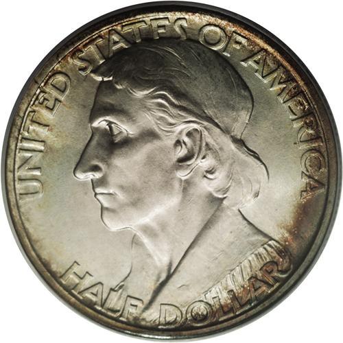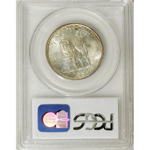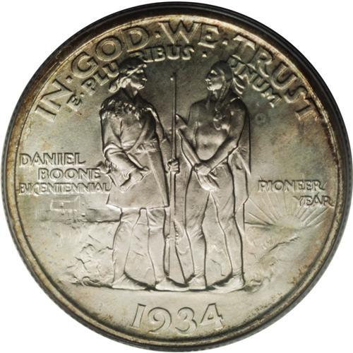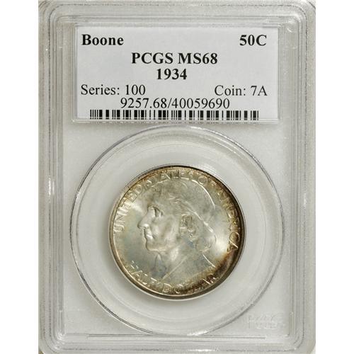 <B>1934 50C Boone MS68 PCGS.</B></I> The Boone series started out innocently enough, with a single issue from the Philadelphia Mint in the amount of 10,007 pieces. The mintage was somewhat low, but no lower than that of the Hawaiian half. Of course, collectors know what followed: 15 more issues, none of them with mintages over 12,012 coins and seven of them represented by under 3,000 examples.<BR> The exceptional commemorative offered here hails from that fateful first issue. Both sides display strong luster with splashes of color at the margins. Gold, russet, and lilac-blue toning appears in a crescent at the right obverse, while the reverse has delicate splashes of orange and canary-yellow. NGC has graded just one 1934 Boone in MS68, and at PCGS, this coin similarly stands alone, with none finer at either service (3/07).<BR><I>From The Cary & Cheryl Porter Collection.</B></I><BR><BR><b>Shipping:</b> Coins & Currency (<a target="_blank" href="http://www.heritageauctions.com/common/shipping.php">view shipping information</a>)