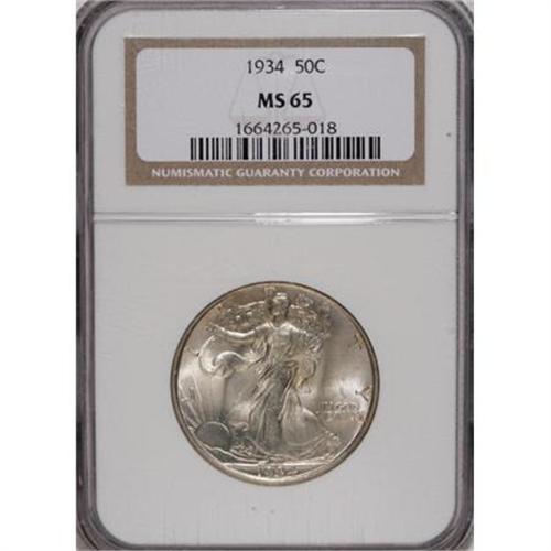 <B>1934 50C MS65 NGC.</B></I> NGC Census: (559/372). PCGS Population (712/566). Mintage: 6,964,000. Numismedia Wsl. Price for NGC/PCGS coin in MS65: $420. (#6592)<BR><BR><B>Coin Engraver:</B> Adolph A. Weinman<BR><BR><b>Shipping:</b> Coins & Currency (<a target="_blank" href="http://www.heritageauctions.com/common/shipping.php">view shipping information</a>)