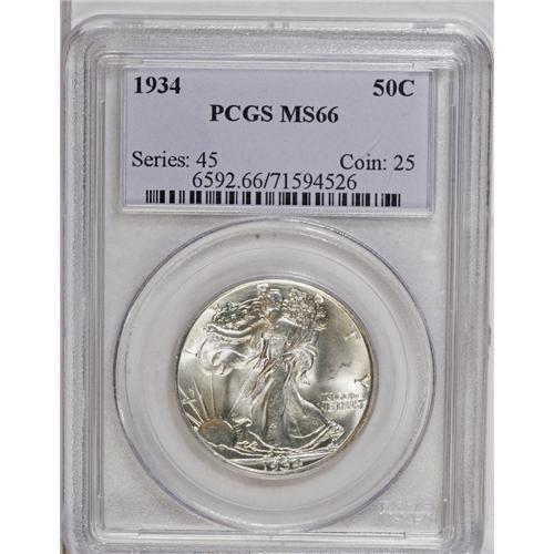 <B>1934<50C> MS66 PCGS.</B></I> A nearly brilliant Gem with velvety luster, excellent detail, and minimal marks aside from a cluster on the lower skirt. The eye appeal is strong.
