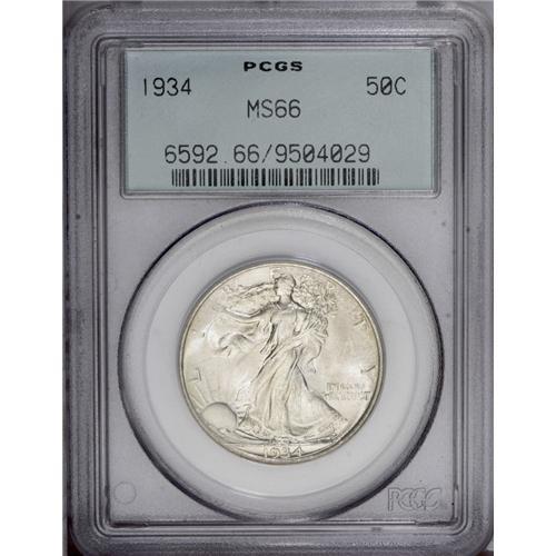 <B>1934<50C> MS66 PCGS.</B></I> Delicate gold and powder-blue tints adorn this lustrous and reasonably struck older holder example. No unpleasant marks are detected.