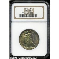<B>1934<50C> MS67 NGC.</B></I> A colorfully toned Superb Gem exhibiting mixed shades of lime-green, reddish-pink, azure-blue, and antique-gold in varying amounts over each side. Boldly defined with no mentionable marks or other distractions. Population: 75 in 67, 6 finer (4/04). <BR><BR><B>Important notice:</B> Heritage usually auctions material at the rate of 200-250 lots per hour. On some occasions eBay Live bid software or the Internet may not be able to keep up with the pace of the auction. We recommend placing a realistic absentee bid now as insurance to avoid disappointment. Occasionally the auctioneer may eliminate or reject an eBay Live bid, and the auctioneer may also reopen a lot after the close of the eBay live bidding (usually because we missed an audience bid), and may reject your bid even if it shows you as the winning bidder. By bidding via eBay Live, you agree that Heritage may award the lot to another bidder at its sole discretion under the circumstances described above or any other reasonable circumstances. Since eBay bids are not shown to us until we open the lot on the floor, we treat those bids just like floor bids. In most cases the floor responds before the eBay bid is presented to us, due to Internet lag time, so for consistency we have made it a policy that floor bids are always considered first over tie eBay live bids. Also please note that all Heritage lots purchased through eBay Live carry a 20% Buyer's Premium. Please make sure you read the Terms and Conditions before you bid.
