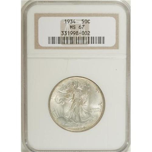 <B>1934 50C MS67 NGC.</B></I> This remarkable example displays a full strike on the obverse, and only the eagle's right (facing) leg reveals faint weakness on the reverse (a virtually universal characteristic of business strikes). The pale silver-gray coloration over each side is enhanced by peach-gold, mint-green, and rose peripheral toning. Rarely seen in such an impressive state of preservation. <BR><I>From The Vanek Collection.</B></I><BR><BR><b>Shipping:</b> Coins & Currency (<a target="_blank" href="http://www.heritageauctions.com/common/shipping.php">view shipping information</a>)