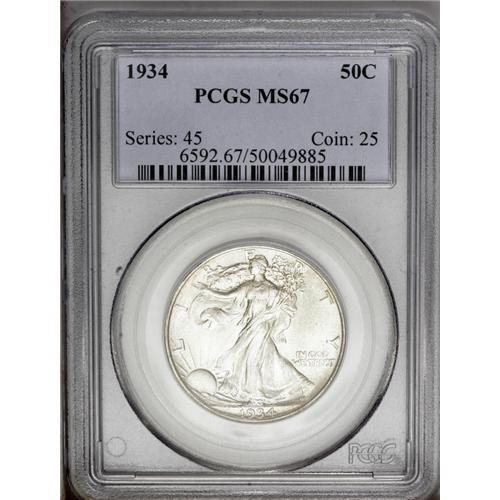 <B>1934<50C> MS67 PCGS.</B></I> Each side is endowed with frosty luster, and displays barely discernible whispers of light tan color. The design elements are sharply impressed, with nice definition apparent on the left thumb and on most of the gown lines. A small contact mark on Liberty's temple is mentioned for accuracy. Population: 118 in 67, 7 finer (3/06). <BR><BR><B>Important notice:</B> Heritage usually auctions material at the rate of 200-250 lots per hour. On some occasions eBay Live bid software or the Internet may not be able to keep up with the pace of the auction. We recommend placing a realistic absentee bid now as insurance to avoid disappointment. Occasionally the auctioneer may eliminate or reject an eBay Live bid, and the auctioneer may also reopen a lot after the close of the eBay live bidding (usually because we missed an audience bid), and may reject your bid even if it shows you as the winning bidder. By bidding via eBay Live, you agree that Heritage may award the lot to another bidder at its sole discretion under the circumstances described above or any other reasonable circumstances. Since eBay bids are not shown to us until we open the lot on the floor, we treat those bids just like floor bids. In most cases the floor responds before the eBay bid is presented to us, due to Internet lag time, so for consistency we have made it a policy that floor bids are always considered first over tie eBay live bids. Also please note that all Heritage lots purchased through eBay Live carry a 20% Buyer's Premium. Please make sure you read the Terms and Conditions before you bid. This lot is being auctioned in conjunction with a live floor auction by Heritage Galleries & Auctioneers. All final auction and invoice information will be supplied by Heritage Galleries & Auctioneers, and all other information should be considered preliminary. Lot:2942 <BR><BR><B>Winning Notification and Billing:</B> After the FINAL session in this auction is complete, Heritage will send e-mail and snail mail invoices. This process normally takes several days. All final auction and invoice information will be supplied by Heritage Galleries & Auctioneers, and all other information should be considered preliminary. <BR><BR>This auction will be conducted on a live auction floor and over the Internet through eBay Live. If you choose to place an absentee bid, please take a moment to <font color='#0000ff'><u><a href='http://pages.ebay.com/liveauctions/help/before/laabsentee.html'>learn how eBay Live absentee bidding works</a></u></font><font color='#000000'>