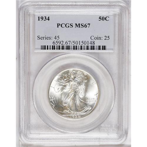 <B>1934<50C> MS67 PCGS.</B></I> Light violet toning floats on the periphery of this brilliant and highly lustrous Superb Gem. The strike is outstanding for the issue. A small dark spot is noted on the N of UNUM.<BR><I>From The Chicago-Ark Collection.</B></I>