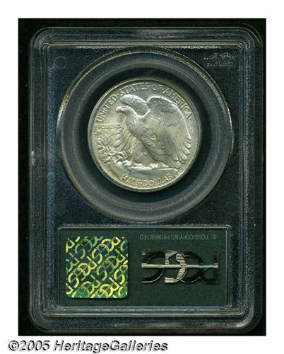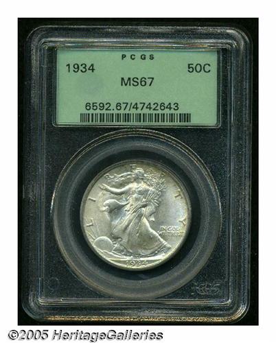 <B>1934<50C> MS67 PCGS.</B></I> This is a remarkable example with fully brilliant silver surfaces and frosty luster. Dusky gold toning may be seen on both sides of this Superb specimen. Only seven finer examples have been certified by PCGS. Population: 119 in 67, 7 finer (5/05).