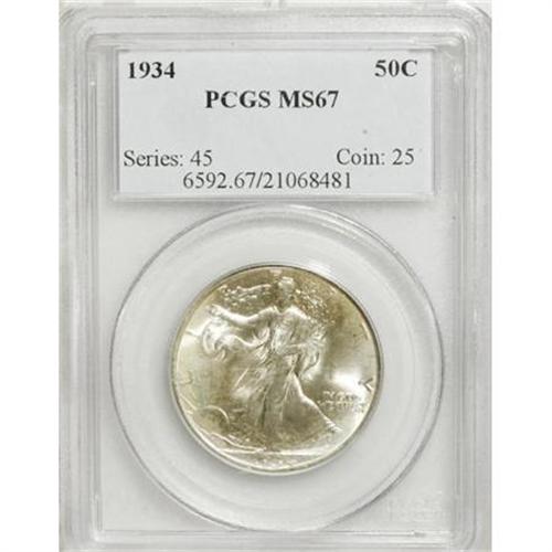 <B>1934 50C MS67 PCGS.</B></I> Liberty appears to gesturing toward a rainbow of pastel colors along the left obverse border. Fainter pale green patina resides along the lower and right obverse periphery. Well struck and impressively preserved, this is an appealing Superb Gem Walker from the era of the Great Depression. <BR><I>From The Mario Eller Collection, Part Two.</B></I><BR><BR><B>Coin Engraver:</B> Adolph A. Weinman<BR><BR><b>Shipping:</b> Coins & Currency (<a target="_blank" href="http://www.heritageauctions.com/common/shipping.php">view shipping information</a>)