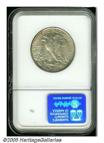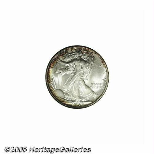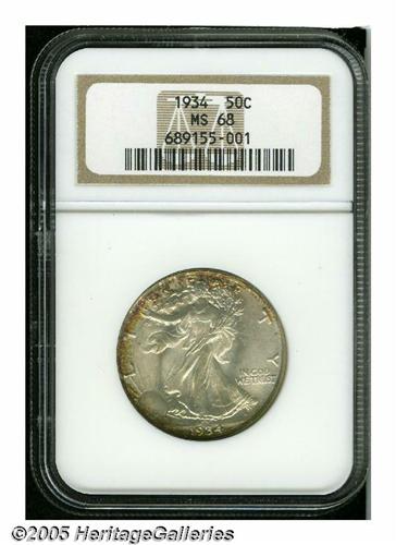 <B>1934<50C> MS68 NGC.</B></I> As the economy began to improve after the depression, the need for half dollars in circulation necessitated increased and more frequent production. This year marked the beginning of a nearly uninterrupted production of Walkers at every branch of the Government Mint through the end of the series. This crisply defined representative is awash in shimmering mint frost. The otherwise silver-gray surfaces reveal a crescent of rich reddish-russet toning around more than half of the obverse periphery, and there is a faint blush of similar color on the reverse rim outside the word UNITED. Blemish-free, as befits the grade, and possessed of endearing originality. Population: 7 in 68, 0 finer (6/05).<BR><I>From The Robert Moreno Collection.</B></I>