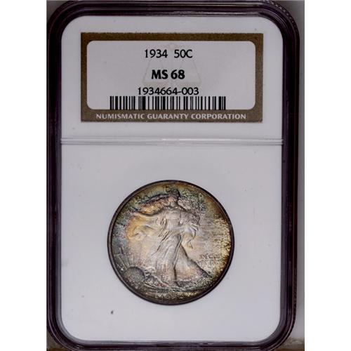<B>1934<50C> MS68 NGC.</B></I> With a mintage of nearly 7 million pieces, the 1934 is available in all grades through sharply struck Gem. In this lofty grade, however, the '34 is nearly unobtainable. NGC and PCGS have certified only 15 examples in MS68, and none finer. This specimen exhibits a sharp strike, including excellent definition on Liberty's left thumb and adjacent branches, and on the gown lines. Radiantly lustrous surfaces are adorned with delicate whispers of cobalt-blue, golden-brown, and lavender patination. Nearly pristine surfaces reveal just a few minor, unobtrusive marks. Census: 8 in 68, 0 finer (3/06). <BR><BR><B>Important notice:</B> Heritage usually auctions material at the rate of 200-250 lots per hour. On some occasions eBay Live bid software or the Internet may not be able to keep up with the pace of the auction. We recommend placing a realistic absentee bid now as insurance to avoid disappointment. Occasionally the auctioneer may eliminate or reject an eBay Live bid, and the auctioneer may also reopen a lot after the close of the eBay live bidding (usually because we missed an audience bid), and may reject your bid even if it shows you as the winning bidder. By bidding via eBay Live, you agree that Heritage may award the lot to another bidder at its sole discretion under the circumstances described above or any other reasonable circumstances. Since eBay bids are not shown to us until we open the lot on the floor, we treat those bids just like floor bids. In most cases the floor responds before the eBay bid is presented to us, due to Internet lag time, so for consistency we have made it a policy that floor bids are always considered first over tie eBay live bids. Also please note that all Heritage lots purchased through eBay Live carry a 20% Buyer's Premium. Please make sure you read the Terms and Conditions before you bid. This lot is being auctioned in conjunction with a live floor auction by Heritage Galleries & Auctioneers. All final auction and invoice information will be supplied by Heritage Galleries & Auctioneers, and all other information should be considered preliminary. Lot:2943 <BR><BR><B>Winning Notification and Billing:</B> After the FINAL session in this auction is complete, Heritage will send e-mail and snail mail invoices. This process normally takes several days. All final auction and invoice information will be supplied by Heritage Galleries & Auctioneers, and all other information should be considered preliminary. <BR><BR>This auction will be conducted on a live auction floor and over the Internet through eBay Live. If you choose to place an absentee bid, please take a moment to <font color='#0000ff'><u><a href='http://pages.ebay.com/liveauctions/help/before/laabsentee.html'>learn how eBay Live absentee bidding works</a></u></font><font color='#000000'>