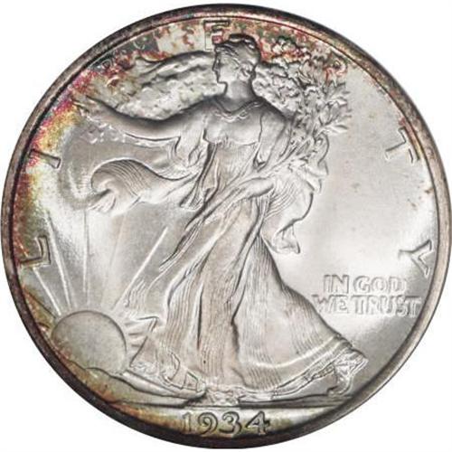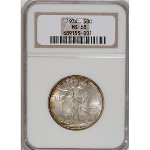 <B>1934 50C MS68 NGC.</B></I> As the economy began to improve after the Great Depression, the need for half dollars in circulation necessitated increased production. This year marked the beginning of a nearly uninterrupted production of Walkers at every branch of the U.S. Mint through the end of the series. This crisply defined representative is awash in shimmering mint frost. The otherwise silver-gray surfaces reveal a crescent of rich reddish-russet toning around more than half of the obverse periphery, and there is a faint blush of similar color on the reverse rim outside the word UNITED. Blemish-free, as befits the grade, and possessed of obvious originality. Census: 8 in 68, 0 finer (12/07). <BR><BR><B>Coin Engraver:</B> Adolph A. Weinman<BR><BR><b>Shipping:</b> Coins & Currency (<a target="_blank" href="http://www.heritageauctions.com/common/shipping.php">view shipping information</a>)