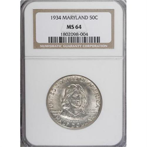 <B>1934 50C Maryland MS64 NGC.</B></I> NGC Census: (1023/1850). PCGS Population (1662/1725). Mintage: 25,015. Numismedia Wsl. Price for NGC/PCGS coin in MS64: $172. (#9328)<BR><BR><b>Shipping:</b> Coins & Currency (<a target="_blank" href="http://www.heritageauctions.com/common/shipping.php">view shipping information</a>\)