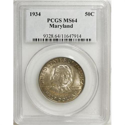 <B>1934 50C Maryland MS64 PCGS.</B></I> PCGS Population (1671/1756). NGC Census: (1023/1857). Mintage: 25,015. Numismedia Wsl. Price for NGC/PCGS coin in MS64: $172. (#9328)<BR><BR><b>Shipping:</b> Coins & Currency (<a target="_blank" href="http://www.heritageauctions.com/common/shipping.php">view shipping information</a>\)