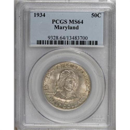 <B>1934 50C Maryland MS64 PCGS.</B></I> PCGS Population (1679/1771). NGC Census: (1023/1855). Mintage: 25,015. Numismedia Wsl. Price for NGC/PCGS coin in MS64: $172. (#9328)<BR><BR><b>Shipping:</b> Coins & Currency (<a target="_blank" href="http://www.heritageauctions.com/common/shipping.php">view shipping information</a>)
