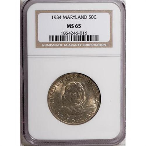 <B>1934 50C Maryland MS65 NGC.</B></I> NGC Census: (1226/624). PCGS Population (1168/557). Mintage: 25,015. Numismedia Wsl. Price for NGC/PCGS coin in MS65: $300. (#9328)<BR><I>From The Frank DuVall Collection of U.S. Commemoratives.</B></I><BR><BR><b>Shipping:</b> Coins & Currency (<a target="_blank" href="http://www.heritageauctions.com/common/shipping.php">view shipping information</a>\)