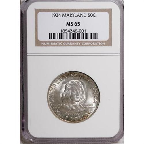 <B>1934 50C Maryland MS65 NGC.</B></I> NGC Census: (1226/624). PCGS Population (1168/557). Mintage: 25,015. Numismedia Wsl. Price for NGC/PCGS coin in MS65: $300. (#9328)<BR><I>From The Frank DuVall Collection of U.S. Commemoratives.</B></I><BR><BR><b>Shipping:</b> Coins & Currency (<a target="_blank" href="http://www.heritageauctions.com/common/shipping.php">view shipping information</a>\)
