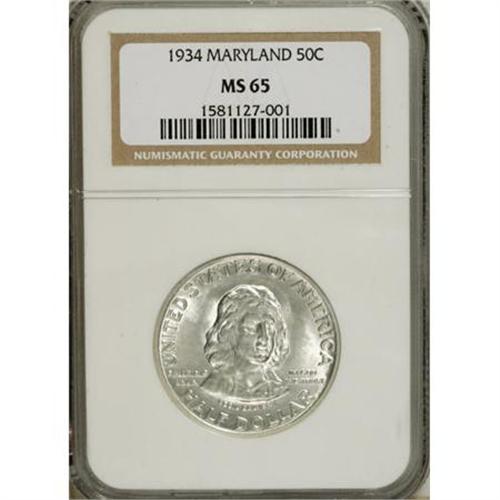 <B>1934 50C Maryland MS65 NGC.</B></I> NGC Census: (1233/622). PCGS Population (1196/576). Mintage: 25,015. Numismedia Wsl. Price for NGC/PCGS coin in MS65: $300. (#9328)<BR><BR><b>Shipping:</b> Coins & Currency (<a target="_blank" href="http://www.heritageauctions.com/common/shipping.php">view shipping information</a>)