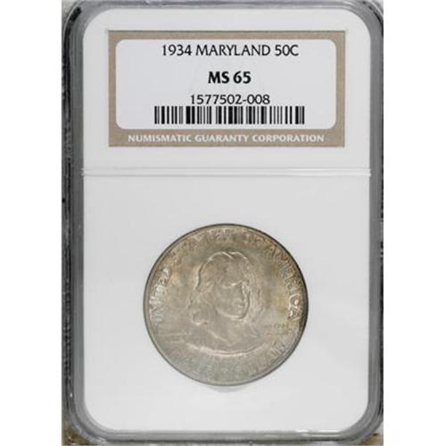 <B>1934 50C Maryland MS65 NGC.</B></I> NGC Census: (1239/628). PCGS Population (1204/580). Mintage: 25,015. Numismedia Wsl. Price for NGC/PCGS coin in MS65: $300. (#9328)<BR><BR><b>Shipping:</b> Coins & Currency (<a target="_blank" href="http://www.heritageauctions.com/common/shipping.php">view shipping information</a>)
