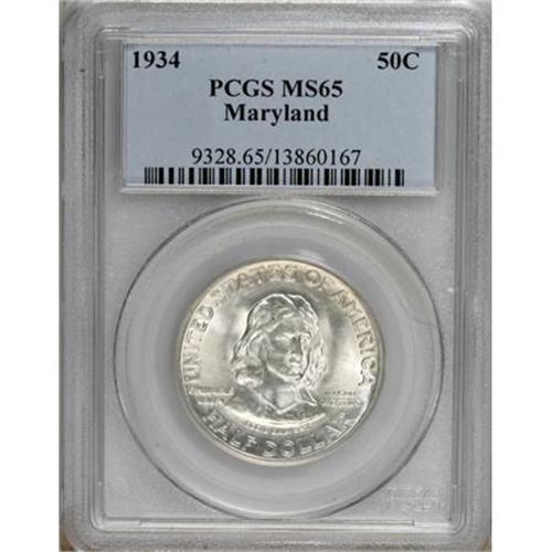 <B>1934 50C Maryland MS65 PCGS.</B></I> PCGS Population (1168/557). NGC Census: (1226/624). Mintage: 25,015. Numismedia Wsl. Price for NGC/PCGS coin in MS65: $300. (#9328)<BR><BR><b>Shipping:</b> Coins & Currency (<a target="_blank" href="http://www.heritageauctions.com/common/shipping.php">view shipping information</a>\)
