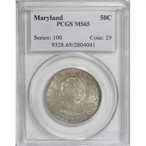 <B>1934 50C Maryland MS65 PCGS.</B></I> PCGS Population (1168/557). NGC Census: (1225/621). Mintage: 25,015. Numismedia Wsl. Price for NGC/PCGS coin in MS65: $300. (#9328)<BR><BR><b>Shipping:</b> Coins & Currency (<a target="_blank" href="http://www.heritageauctions.com/common/shipping.php">view shipping information</a>\)