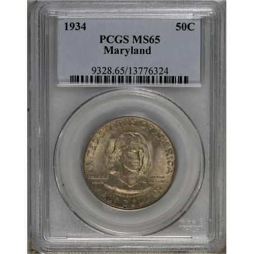 <B>1934 50C Maryland MS65 PCGS.</B></I> PCGS Population (1206/585). NGC Census: (1244/632). Mintage: 25,015. Numismedia Wsl. Price for NGC/PCGS coin in MS65: $290. (#9328)<BR><BR><b>Shipping:</b> Coins & Currency (<a target="_blank" href="http://www.heritageauctions.com/common/shipping.php">view shipping information</a>)