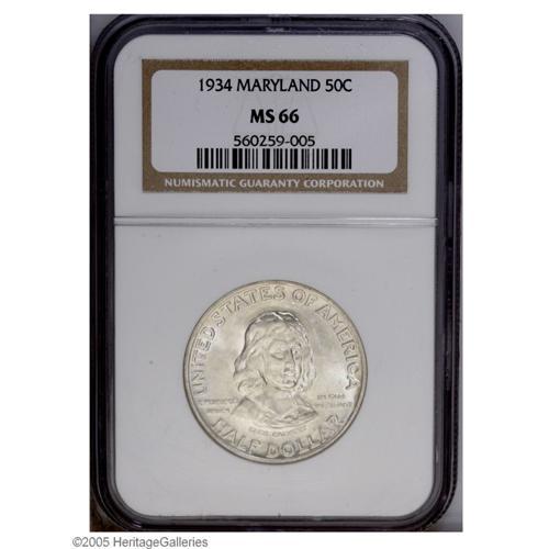 <B>1934<50C> Maryland MS66 NGC.</B></I> Brilliant white surfaces display dazzling luster. A couple of trivial marks on Calvert's bust are mentioned for accuracy.