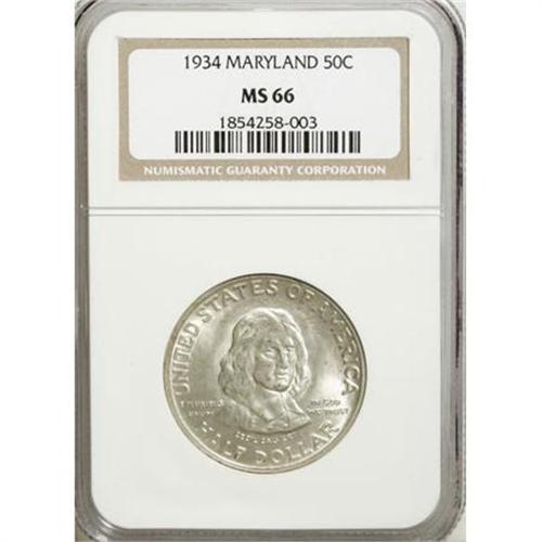 <B>1934 50C Maryland MS66 NGC.</B></I> NGC Census: (554/70). PCGS Population (514/43). Mintage: 25,015. Numismedia Wsl. Price for NGC/PCGS coin in MS66: $700. (#9328)<BR><I>From The Frank DuVall Collection of U.S. Commemoratives.</B></I><BR><BR><b>Shipping:</b> Coins & Currency (<a target="_blank" href="http://www.heritageauctions.com/common/shipping.php">view shipping information</a>\)