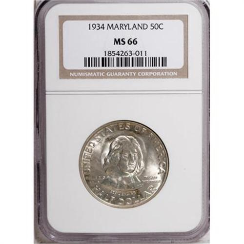 <B>1934 50C Maryland MS66 NGC.</B></I> NGC Census: (554/70). PCGS Population (514/43). Mintage: 25,015. Numismedia Wsl. Price for NGC/PCGS coin in MS66: $700. (#9328)<BR><I>From The Frank DuVall Collection of U.S. Commemoratives.</B></I><BR><BR><b>Shipping:</b> Coins & Currency (<a target="_blank" href="http://www.heritageauctions.com/common/shipping.php">view shipping information</a>\)