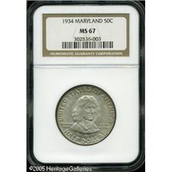 <B>1934 50C Maryland MS67 NGC.</B></I> A beautifully preserved, frosty representative with soft beige and grayish-violet patination. Well struck, with just a few minute marks on Calvert's portrait. Population: 43 in 67, 1 finer (1/05). Lot:8522