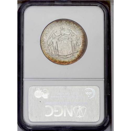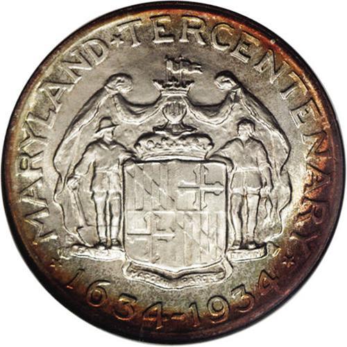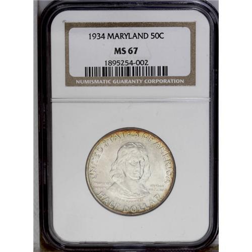 <B>1934<50C> Maryland MS67 NGC.</B></I> A bright satiny sheen endows both sides of this lovely Maryland commemorative. Whispers of reddish-gold toning, which is a shade deeper and slightly more extensive on the reverse, gravitates to the peripheries, leaving the center areas essentially untoned. The design elements are sharply impressed, and the impeccably preserved surfaces are devoid of significant marks. NGC has seen just two specimens grading finer, and PCGS has certified none finer (3/06). <BR><BR><B>Important notice:</B> Heritage usually auctions material at the rate of 200-250 lots per hour. On some occasions eBay Live bid software or the Internet may not be able to keep up with the pace of the auction. We recommend placing a realistic absentee bid now as insurance to avoid disappointment. Occasionally the auctioneer may eliminate or reject an eBay Live bid, and the auctioneer may also reopen a lot after the close of the eBay live bidding (usually because we missed an audience bid), and may reject your bid even if it shows you as the winning bidder. By bidding via eBay Live, you agree that Heritage may award the lot to another bidder at its sole discretion under the circumstances described above or any other reasonable circumstances. Since eBay bids are not shown to us until we open the lot on the floor, we treat those bids just like floor bids. In most cases the floor responds before the eBay bid is presented to us, due to Internet lag time, so for consistency we have made it a policy that floor bids are always considered first over tie eBay live bids. Also please note that all Heritage lots purchased through eBay Live carry a 20% Buyer's Premium. Please make sure you read the Terms and Conditions before you bid. This lot is being auctioned in conjunction with a live floor auction by Heritage Galleries & Auctioneers. All final auction and invoice information will be supplied by Heritage Galleries & Auctioneers, and all other information should be considered preliminary. Lot:5004 <BR><BR><B>Winning Notification and Billing:</B> After the FINAL session in this auction is complete, Heritage will send e-mail and snail mail invoices. This process normally takes several days. All final auction and invoice information will be supplied by Heritage Galleries & Auctioneers, and all other information should be considered preliminary. <BR><BR>This auction will be conducted on a live auction floor and over the Internet through eBay Live. If you choose to place an absentee bid, please take a moment to <font color='#0000ff'><u><a href='http://pages.ebay.com/liveauctions/help/before/laabsentee.html'>learn how eBay Live absentee bidding works</a></u></font><font color='#000000'>