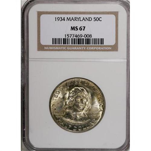 <B>1934 50C Maryland MS67 NGC.</B></I> Both sides of this Superb Gem have lovely olive and gold toning with splashes of pale blue and lilac toning. The design elements are bold for the issue, although Calvert's nose shows more typical softness. NGC has graded only two finer pieces (1/08).<BR><BR><b>Shipping:</b> Coins & Currency (<a target="_blank" href="http://www.heritageauctions.com/common/shipping.php">view shipping information</a>)