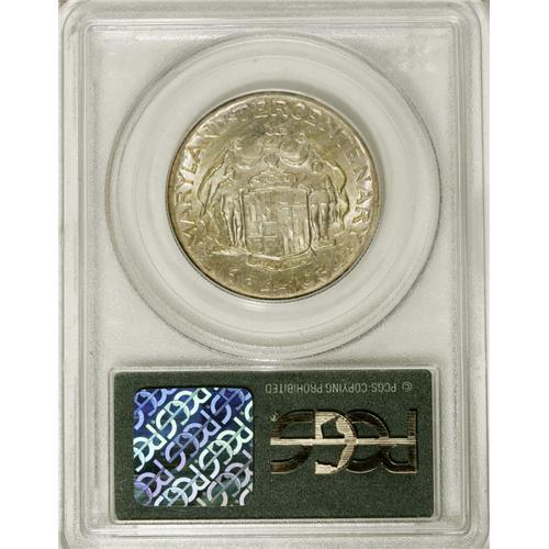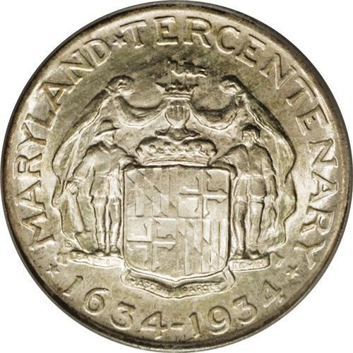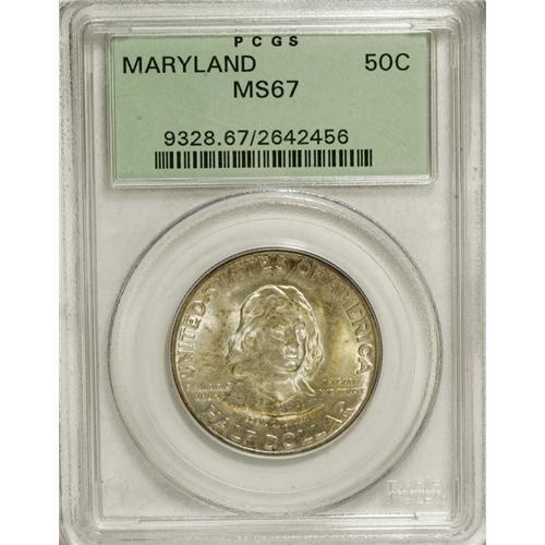 <B>1934 50C Maryland MS67 PCGS.</B></I> Olive and sky-blue invigorate this lustrous and unabraded Superb Gem. The strike is bold throughout, apart from minor incompleteness on the shield and profile. The Maryland type was the only single-year design issued in 1934. Certified in an old green label holder. Population: 43 in 67, 0 finer (1/07).<BR><BR><b>Shipping:</b> Coins & Currency (<a target="_blank" href="http://www.heritageauctions.com/common/shipping.php">view shipping information</a>)