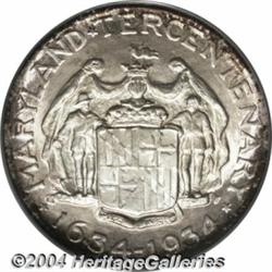 <B>1934<50C> Maryland MS67 PCGS.</B></I> Rose, apricot, and sky-blue hues ensure the originality of this reasonably struck and lovingly preserved Superb Gem. This gently toned and pleasing Commemorative is deserving of the finest specialized cabinet. The crowned arms and the portrait of Cecil Calvert are somewhat similar to the designs on the rare Lord Baltimore colonial pieces. Population: 42 in 67, none finer (6/04).<BR><I>From the JFS Collection, the #1 All-Time PCGS Registry Set.</B></I> <BR><BR><B>Important notice:</B> Heritage usually auctions material at the rate of 200-250 lots per hour. On some occasions eBay Live bid software or the Internet may not be able to keep up with the pace of the auction. We recommend placing a realistic absentee bid now as insurance to avoid disappointment. Occasionally the auctioneer may eliminate or reject an eBay Live bid, and the auctioneer may also reopen a lot after the close of the eBay live bidding (usually because we missed an audience bid), and may reject your bid even if it shows you as the winning bidder. By bidding via eBay Live, you agree that Heritage may award the lot to another bidder at its sole discretion under the circumstances described above or any other reasonable circumstances. Since eBay bids are not shown to us until we open the lot on the floor, we treat those bids just like floor bids. In most cases the floor responds before the eBay bid is presented to us, due to Internet lag time, so for consistency we have made it a policy that floor bids are always considered first over tie eBay live bids. Also please note that all Heritage lots purchased through eBay Live carry a 20% Buyer's Premium. Please make sure you read the Terms and Conditions before you bid. </span></font></tr></table></td></tr></table>