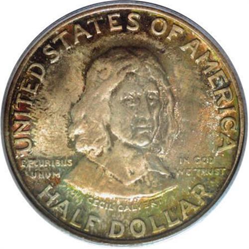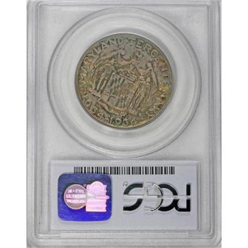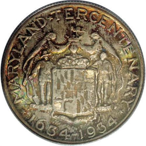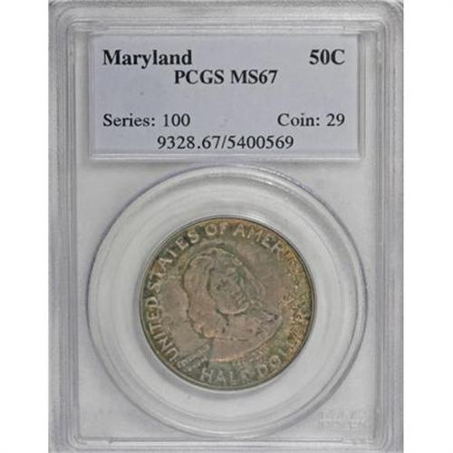 <B>1934 50C Maryland MS67 PCGS.</B></I> Hans Schuler's only commemorative design credit comes from the Maryland half, represented by this attractive Superb Gem. Hazy lilac and iridescent violet and lime-green patina graces both sides, and soft, yet vibrant luster shines beneath. A lovely piece, tied for the finest certified by PCGS (11/07).<BR><BR><b>Shipping:</b> Coins & Currency (<a target="_blank" href="http://www.heritageauctions.com/common/shipping.php">view shipping information</a>)