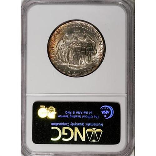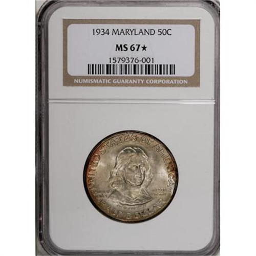 <B>1934 50C Maryland MS67 <img src="/images/star.gif" width="10" height="10" alt="" border="0"> NGC.</B></I> More than 250 years after coins circulated in Maryland bearing the portrait of Cecil Calvert, history repeated itself as his bust appeared on the Maryland tercentenary commemorative. A lustrous and smooth Superb Gem with splashes of orange-red along the borders. Census: 5 in 67 <img src="/images/star.gif" width="10" height="10" alt="" border="0">, none finer with a Star designation (1/08).<BR><BR><b>Shipping:</b> Coins & Currency (<a target="_blank" href="http://www.heritageauctions.com/common/shipping.php">view shipping information</a>)