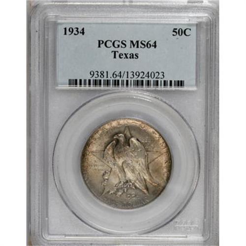 <B>1934 50C Texas MS64 PCGS.</B></I> PCGS Population (1308/1414). NGC Census: (559/1129). Mintage: 61,463. Numismedia Wsl. Price for NGC/PCGS coin in MS64: $142. (#9381)<BR><BR><b>Shipping:</b> Coins & Currency (<a target="_blank" href="http://www.heritageauctions.com/common/shipping.php">view shipping information</a>)