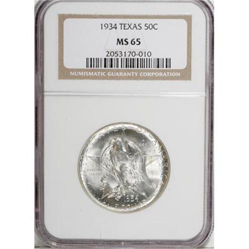 <B>1934 50C Texas MS65 NGC.</B></I> NGC Census: (746/378). PCGS Population (1051/340). Mintage: 61,463. Numismedia Wsl. Price for NGC/PCGS coin in MS65: $292. (#9381)<BR><BR><b>Shipping:</b> Coins & Currency (<a target="_blank" href="http://www.heritageauctions.com/common/shipping.php">view shipping information</a>)