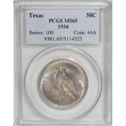 <B>1934 50C Texas MS65 PCGS.</B></I> PCGS Population (1040/336). NGC Census: (737/367). Mintage: 61,463. Numismedia Wsl. Price for NGC/PCGS coin in MS65: $292. (#9381)<BR><BR><b>Shipping:</b> Coins & Currency (<a target="_blank" href="http://www.heritageauctions.com/common/shipping.php">view shipping information</a>\)