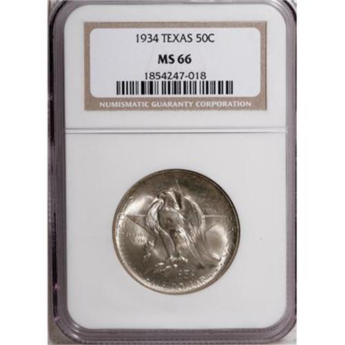 <B>1934 50C Texas MS66 NGC.</B></I> NGC Census: (337/37). PCGS Population (298/38). Mintage: 61,463. Numismedia Wsl. Price for NGC/PCGS coin in MS66: $380. (#9381)<BR><I>From The Frank DuVall Collection of U.S. Commemoratives.</B></I><BR><BR><b>Shipping:</b> Coins & Currency (<a target="_blank" href="http://www.heritageauctions.com/common/shipping.php">view shipping information</a>\)